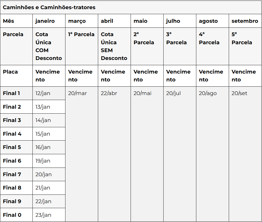 Os caminhões têm prazos diferenciados: para o pagamento integral em janeiro é concedido desconto de 3%; aos que escolherem pagar em cota única, sem desconto, é 22 de abril. Para os proprietários que optarem pelo parcelamento em três, quatro ou cinco vezes, sem desconto, os vencimentos são em 20 de março, 20 de maio, 20 de julho, 20 de agosto e 20 de setembro.