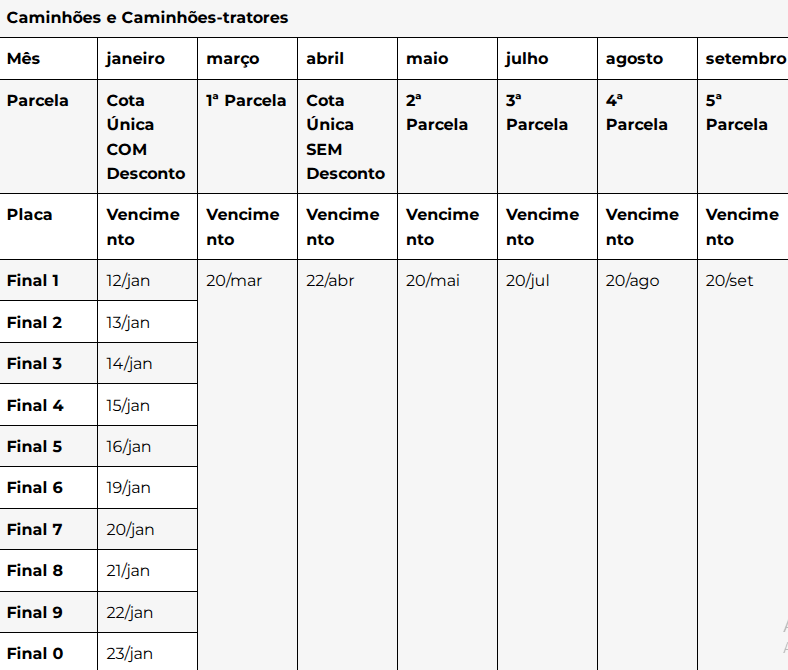 A tabela de pagamento para proprietários de veículos de carga é diferente. O pagamento pode ser feito, sem desconto, até 22 de abril, ou parcelado em até cinco vezes, com data fixada no dia 20 de cada mês.