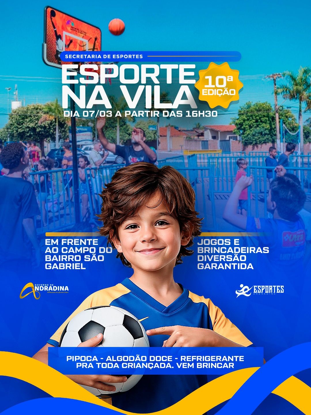 A Secretaria de Esportes promove no dia 7 de março, a partir das 16h30, a 10ª edição do Esporte na Vila. O evento será realizado em frente ao campo do bairro São Gabriel e promete reunir crianças, jovens e famílias para uma tarde de lazer e integração comunitária.
