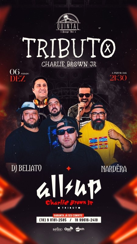 QUINTAL LOUNGE BAR - SÁBADO - 06/12 - 21h30 - TRIBUTO CHARLIE BROWN JR COM ALL UP / NARDÊRA POP ROCK / DJ BELIATO
