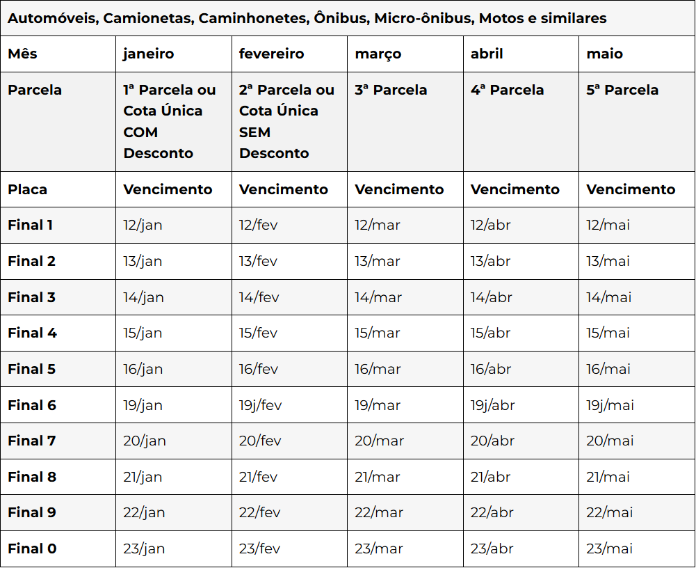 Os proprietários poderão escolher entre as seguintes formas de pagamento com vencimentos de acordo com o final de placa do veículo: