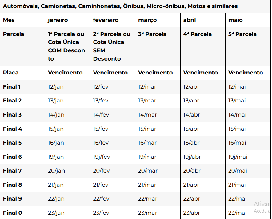 O pagamento segue o final da placa do veículo e pode ser feito à vista, com desconto de 3%, ou parcelado em até 5 vezes, de acordo com o valor do imposto devido.