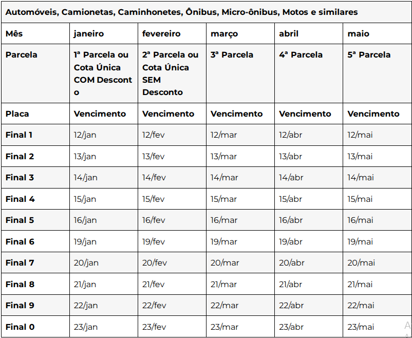 É o caso da placa final 8, cujo vencimento foi no dia 21, porém, o pagamento pode ser feito até esta quarta-feira (22), quando vence também a placa final 9. O calendário termina nesta quinta-feira (23) para os veículos com final 0. Confira todas as datas na tabela abaixo.