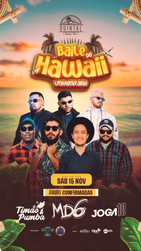 QUINTAL LOUNGE BAR - SÁBADO - 15/11 - 21h - BAILE DO HAWAII UNIVERSITÁRIO - TIMÃO & PUMBA / MD6 / JOGA10