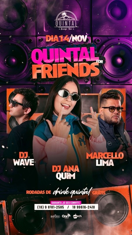 QUINTAL LOUNGE BAR - SEXTA – 14/11 – 21h - QUINTAL FOR FRIENDS - DJ ANA QUIM / DJ WAVE / DJ MARCELLO LIMA
