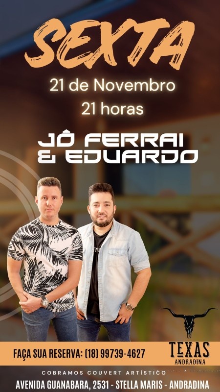 TEXAS ANDRADINA - SEXTA - 21/11 - 21h - JÔ FERRAI & EDUARDO